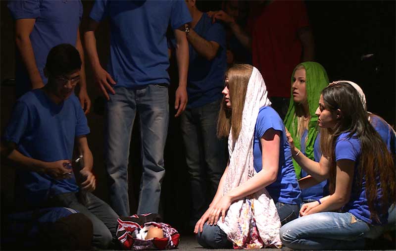Bei den ersten nonverbalen Kennenlernspielen und dem zunächst zaghaften Abtasten wird eine Annäherung beider Gruppen erlebbar. Die Kamera, gedreht im Stile des Direct Cinema ist immer dabei wenn in den Partnerübungen erste Szenen ausprobiert werden. Die Flüchtlinge thematisieren ihre noch präsenten Erlebnisse der Flucht nach Europa. In den entwickelten Szenen geht es um erlittene Gewalt durch die Grenzpolizei, der Fahrt in überfülltem Boot über das Meer oder dem Miterleben vom Sterben anderer Flüchtlinge. Die SuS hingegen träumen von einer gelungenen Karriere als Boxerin oder Modedesigner und wünschen sich eine spannende Weltreise. Angesichts der erfahrenen Schicksale der Flüchtlinge, machen sich die SuS Gedanken über ihr eigenes von Wohlstand und Frieden geprägtes Leben. Je näher die Premiere jedoch rückt, desto hektischer und schneller werden die Proben am immer noch nicht fertigen gemeinsamen Stück. Die Spannung wächst und letzte Besetzungsprobleme müssen gelöst werden. Die auf der Bühne dargestellten von den Flüchtlingen wirklich erlebten Szenen ihrer Flucht, gehen unter die Haut.